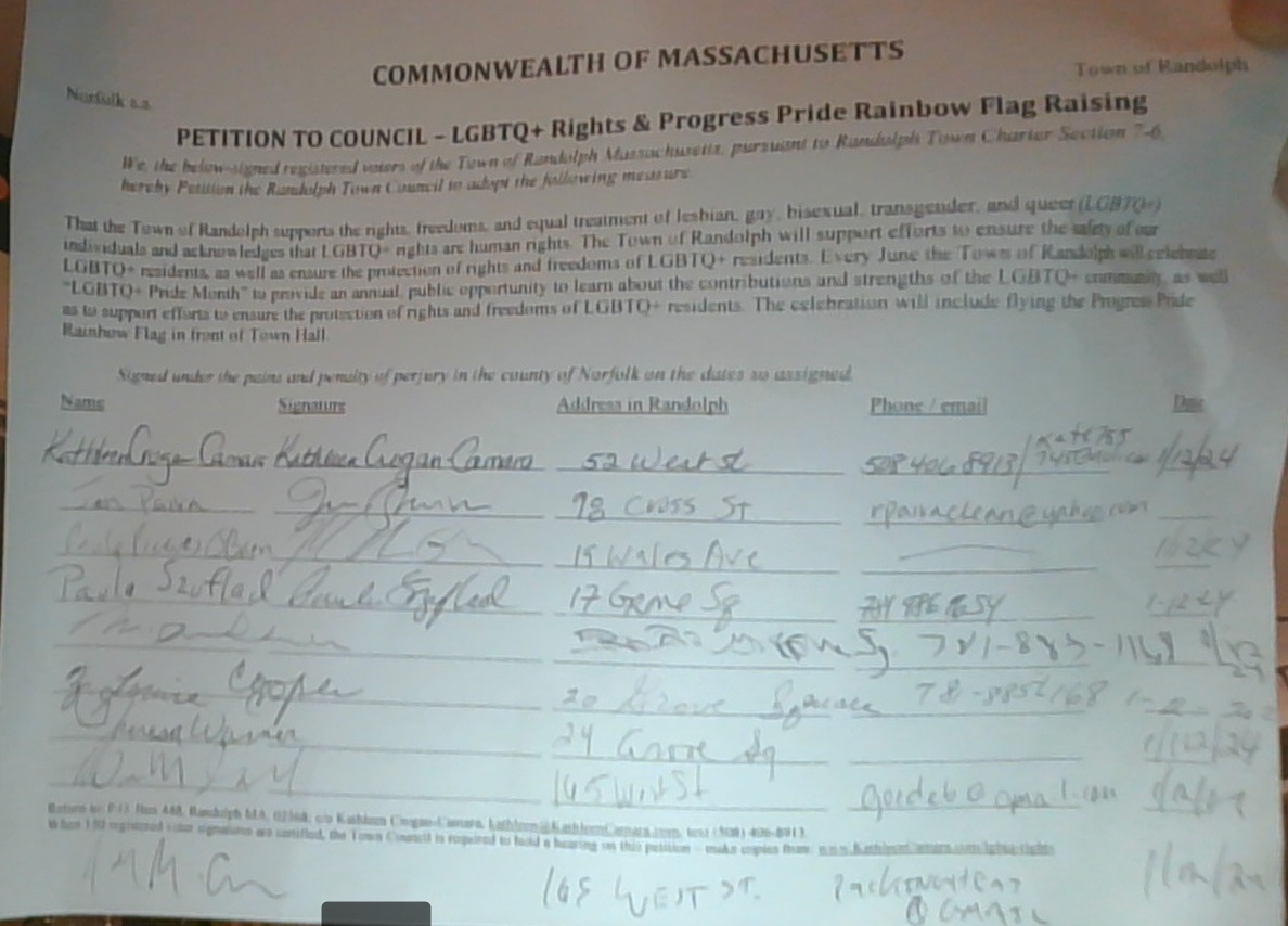PETITION TO COUNCIL -- LGBTQ+ Rights & Progress Pride Rainbow Flag RaisingThat the Town of Randolph supports the rights, freedoms, and equal treatment of lesbian, gay, bisexual, transgender, and queer (LGBTQ+) individuals and acknowledges that LGBTQ+ rights are human rights. The Town of Randolph will support efforts to ensure the safety of our LGBTQ+ residents, as well as ensure the protection of rights and freedoms of LGBTQ+ residents. Every June the Town of Randolph will celebrate "LGBTQ+ Pride Month" to provide an annual, public opportunity to learn about the contributions and strengths of the LGBTQ+ community, as well as to support efforts to ensure the protection of rights and freedoms of LGBTQ+ residents. The celebration will include flying the Progress Pride Rainbow Flag in front of Town Hall. See press release by Kathleen Crogan-Camara too